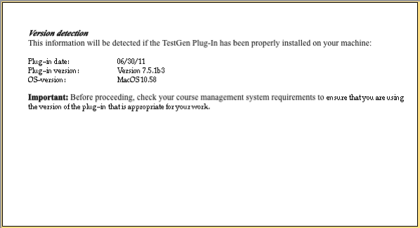 To confirm successful installation of the TestGen Plug-in, check for the display of a test box below. The test box contents should appear here:If you see a test box above (its contents should be similar to this image), then the TestGen Plug-in installed successfully on your computer.