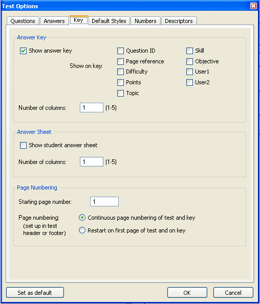 Select this option to display the answer key that follows the last page of the test. Check the desired boxes to display additional information on the answer key. If no point values have been assigned to individual questions, then all questions will display a point value of "1". When descriptor categories, such as topic or page references, are unavailable for the selected test items, they are dimmed and cannot be selected for printing on the answer key.
